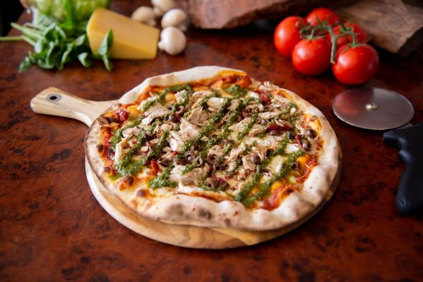 Chicken breast fillet, semi-dried tomatoes, Kalamata olives, fresh mushroom, mozzarella, and pesto genovese