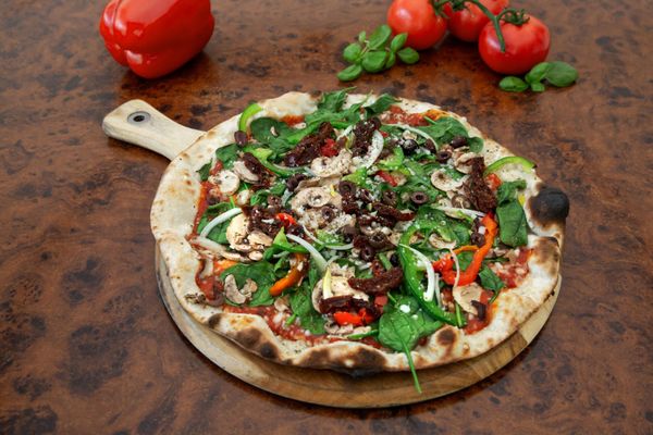Baby spinach, semi-dried tomatoes, garlic oil, fresh onion, roasted red capsicum, green capsicum, olives, fresh mushroom, and vegan cheese