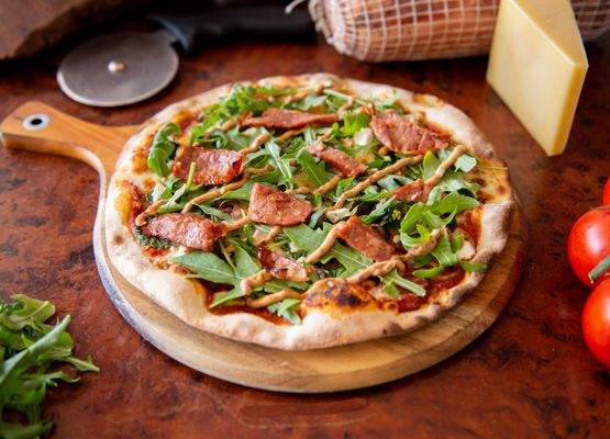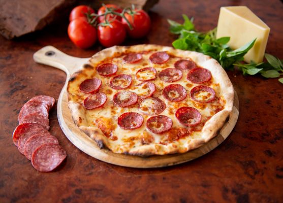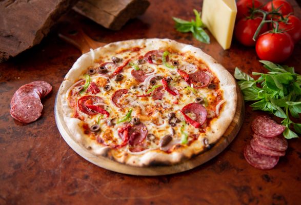 Salami pepperoni, fresh onion, roasted red capsicum, green capsicum, Kalamata olives, chilli flakes, and mozzarella