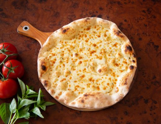Garlic butter and parsley leaves topped with mozzarella cheese on a thin base