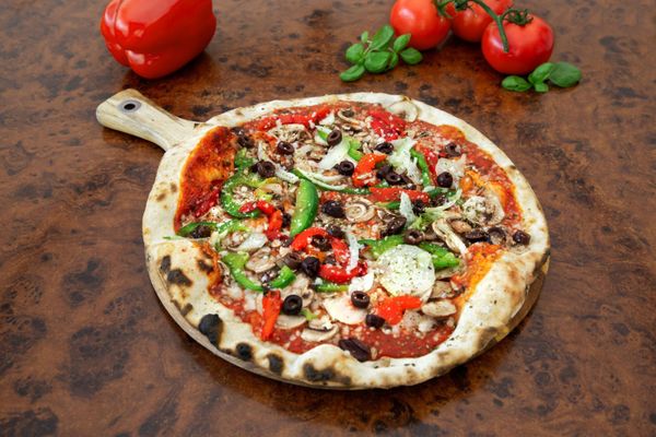 Fresh onion, roast red capsicum, green capsicum, olives, fresh mushroom, and vegan cheese