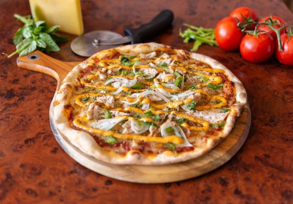 Chicken breast fillet, green capsicum, caramelised onion, fresh onion, buffalo mozzarella cheese, shallots, mozzarella, and peri-peri sauce