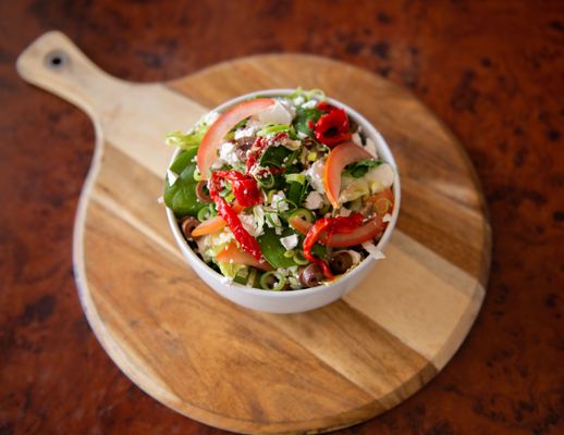 Crispy lettuce, Greek feta, fresh tomatoes, Kalamata olives, Spanish onions, green capsicum, and dressing oil