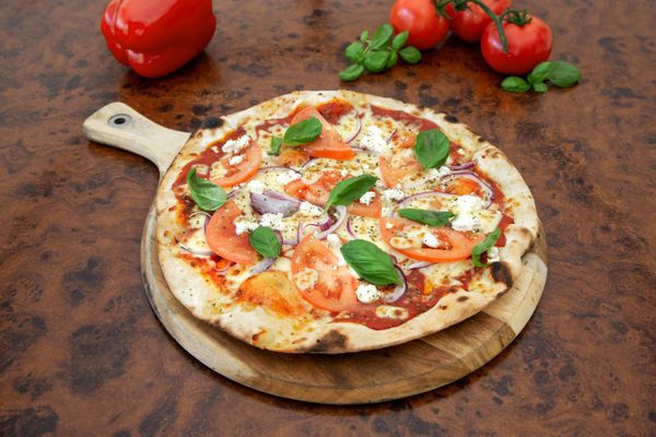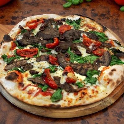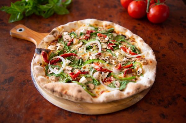Baby spinach, Danish feta, semi-dried tomatoes, garlic oil, fresh onion, roast red capsicum, green capsicum, olives, fresh mushroom, and mozzarella