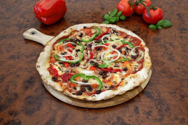 Fresh onion, roast red capsicum, green capsicum, olives, fresh mushroom, and mozzarella