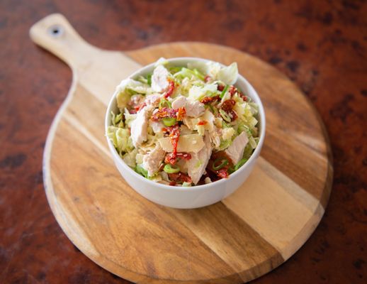 Crispy lettuce, chicken breast fillet, baby spinach, shaved Parmesan, semi-dried tomatoes, Kalamata olives, and pesto genovese