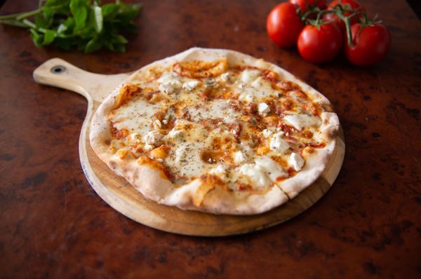 Buffalo mozzarella cheese, Danish feta, creamy blue cheese, Parmesan cheese, and mozzarella