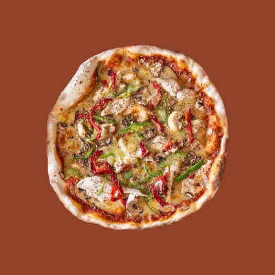 Chicken breast fillet, fresh mushroom, roasted red capsicum, green capsicum, fresh onion, and mozzarella