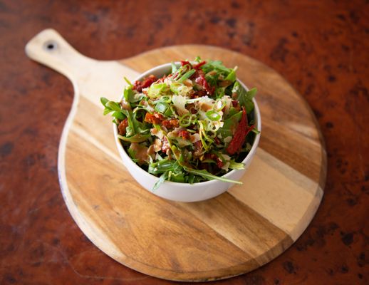 Fresh rocket, shaved Parmesan, semi-dried tomatoes and dressing oil