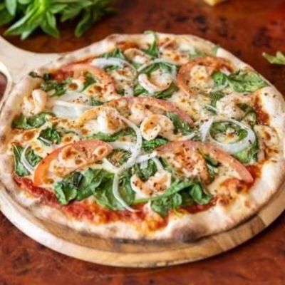 Garlic prawns, baby spinach, fresh onion, fresh tomatoes, chilli flakes, and mozzarella
