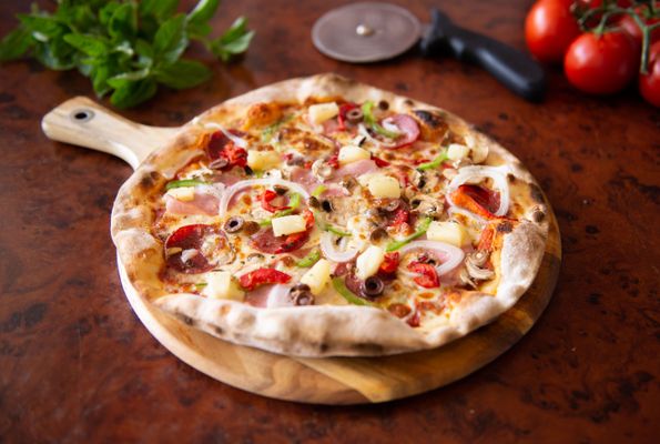 Double smoked ham, fresh mushroom, mild cabanossi, hot salami pepperoni, roasted red capsicum, green capsicum, fresh onion, sweet pineapple, Kalamata olives and mozzarella