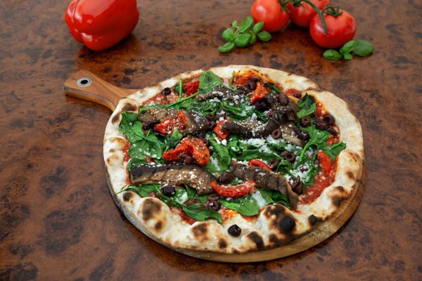 Marinated eggplant, roasted tomato, baby spinach, Kalamata olives, and vegan cheese